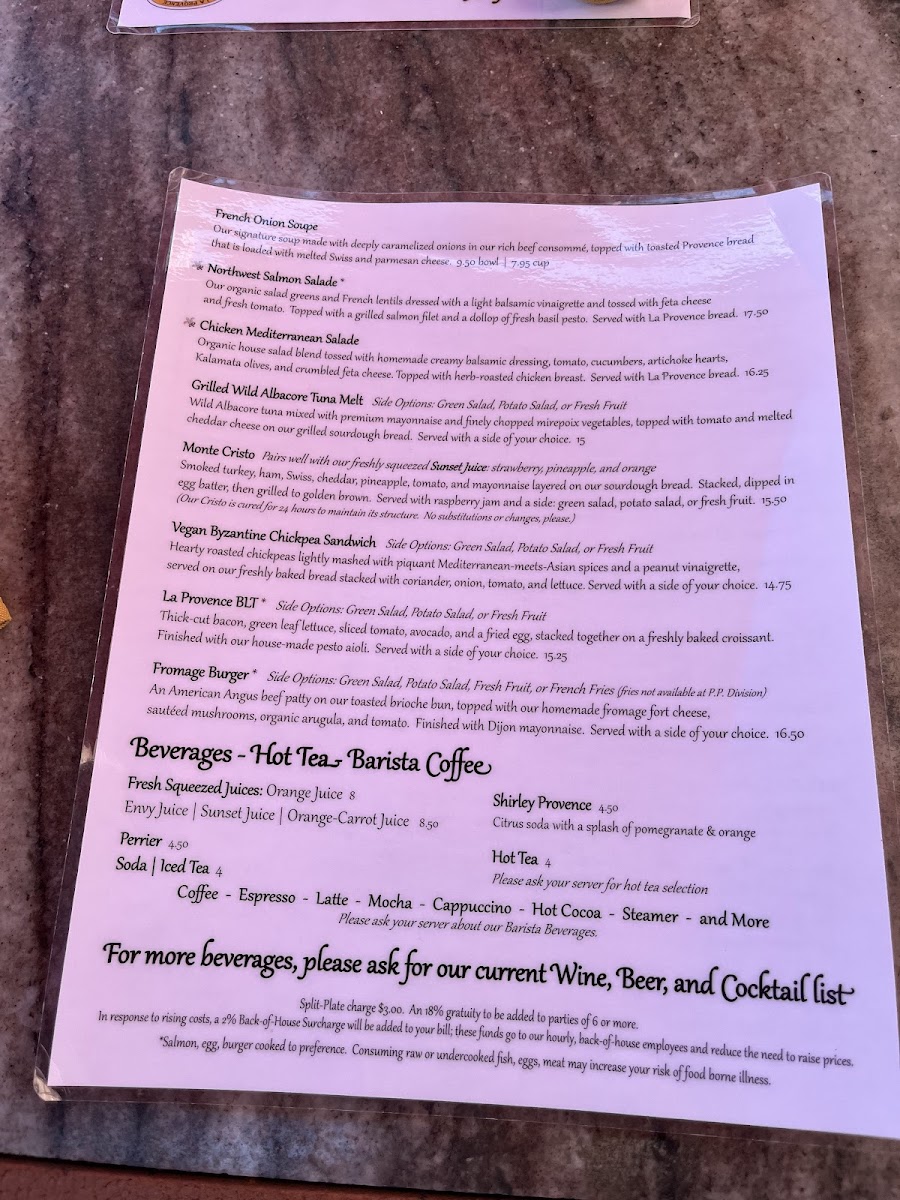 Welcome to La Provence Boulangerie & Patisserie, a delightful gem located at 937 NE Orenco Station Loop, Hillsboro, OR. This charming establishment embodies a true French atmosphere, serving as both a bakery and a restaurant. The menu features an array of sumptuous dishes that are sure to impress. Start your experience with the Salmon & Curried Quinoa Salad, a vibrant blend of grilled salmon, curried quinoa, and fresh pesto over organic greens, creating a burst of flavors for $19.25. The buttery, crispy croissants adorned with homemade jams have garnered rave reviews, and are a must-try for any visitor. For dessert, indulge in the rich Black Beauty Chocolate Cake or the refreshing Lemon Tart. With quick service and a warm atmosphere, La Provence ensures that every visit feels like a special occasion. Don't forget to arrive early to savor this culinary delight before it gets busy!